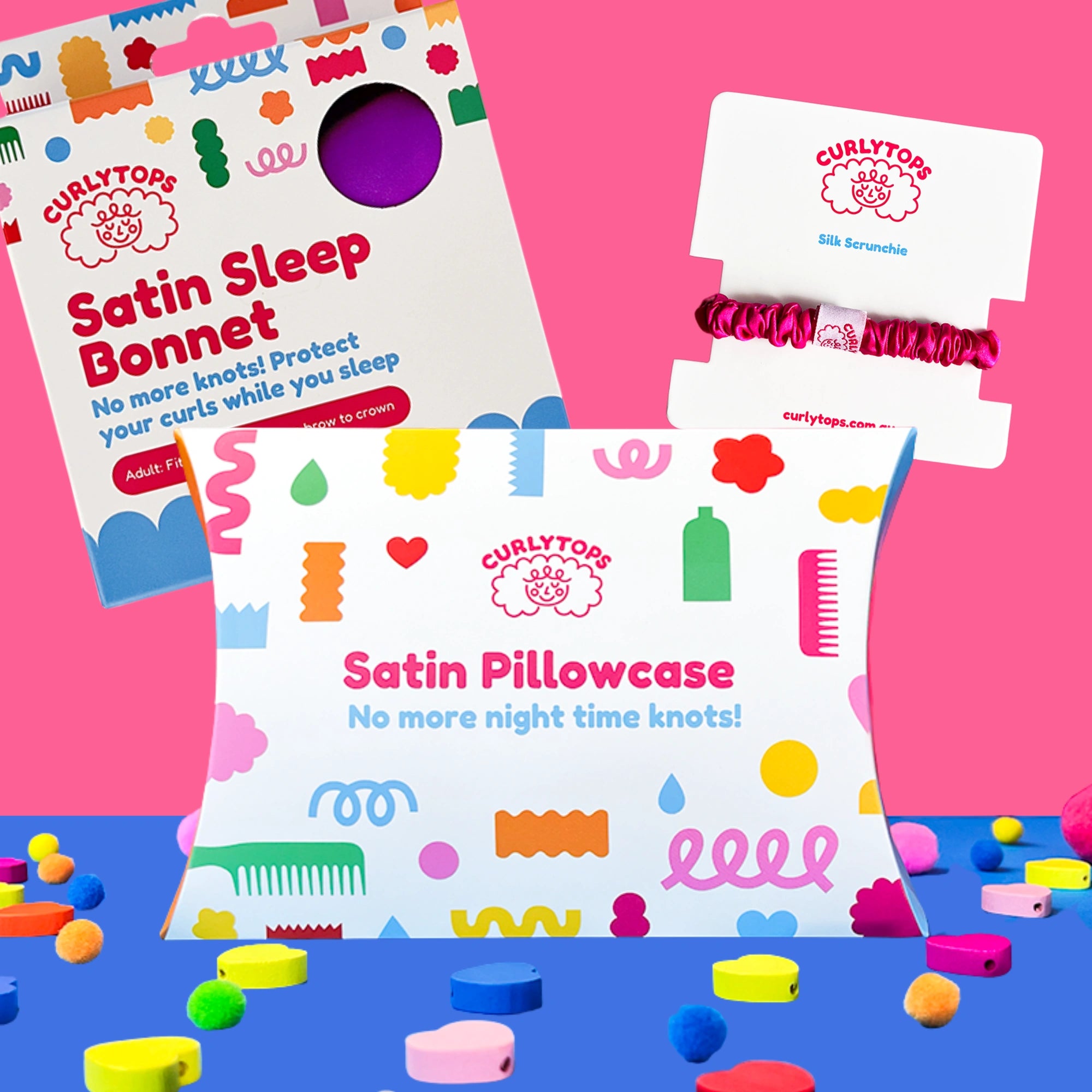 Tuck your curls into the Ultimate Curl Sleep Sanctuary, the all-in-one bedtime bundle for maximum night-time protection. This satin sleep set for curly hair combines three curl-loving essentials: a Curlytops Satin Pillowcase, a Curlytops Silk Scrunchie and an adult-sized Curlytops Satin Sleep Bonnet.